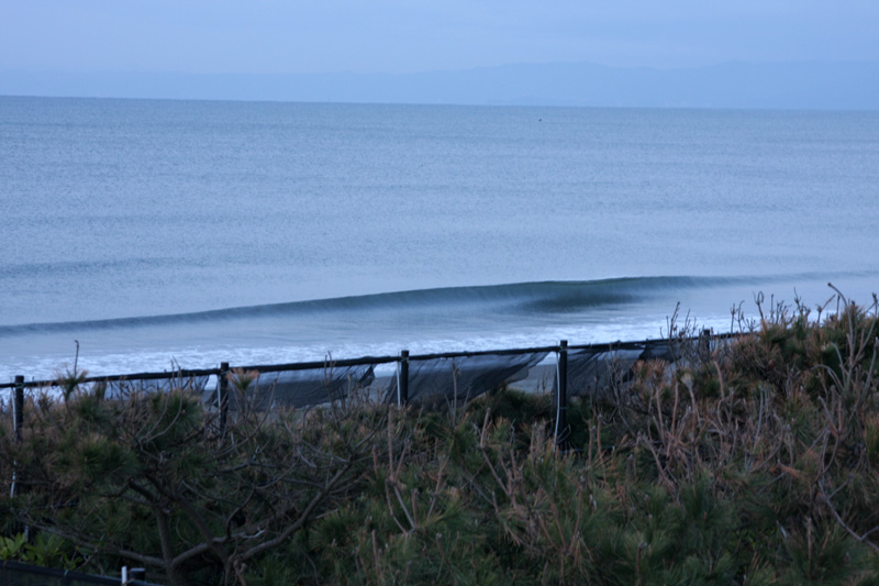 今朝の海は強いオフショアにビュービュー煽られてサイズダウン。